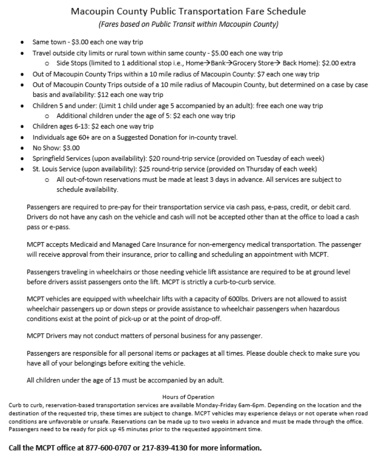 Macoupin County Public Transportation serves the public therefore, riders may experience delays and/or additional wait time.